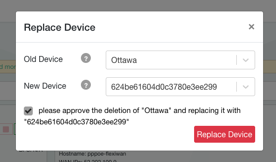 On the following pop-up confirm which device is the device being replaced and which device is the replacement device. In this example, Ottawa device is old and new device is not yet named. Lastly, approve the original device deletion after which the new device will have the settings and name from the original device.